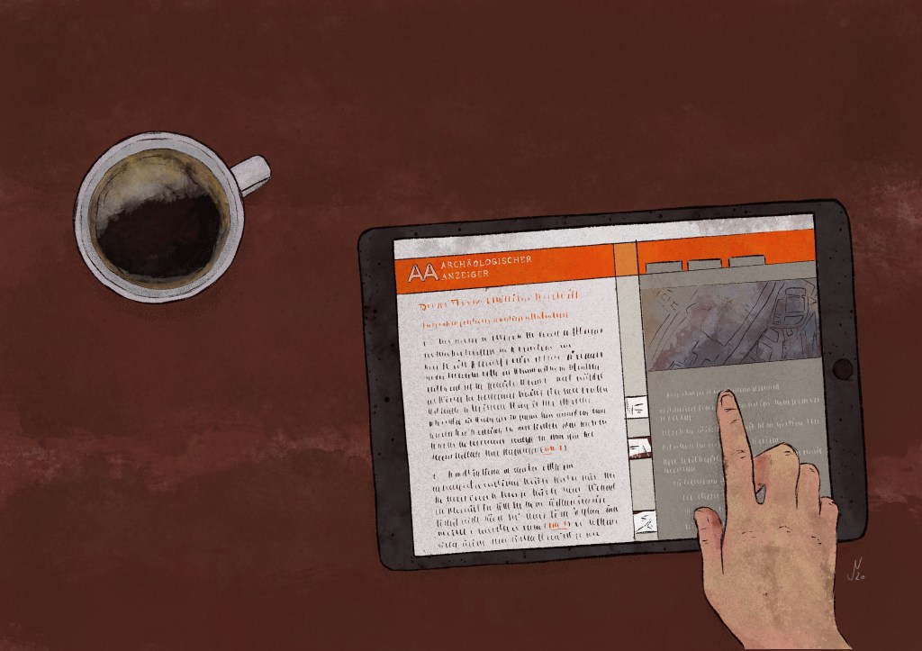 Series of illustrations on the evolution of scientific publishing for an article about the “Archäologischer Anzeiger” and the new DAI lense viewer in “Archäologie Weltweit” resp. “Archaeology World-wide” 1/2020, a magazine of the German Archaeological Institute (DAI).