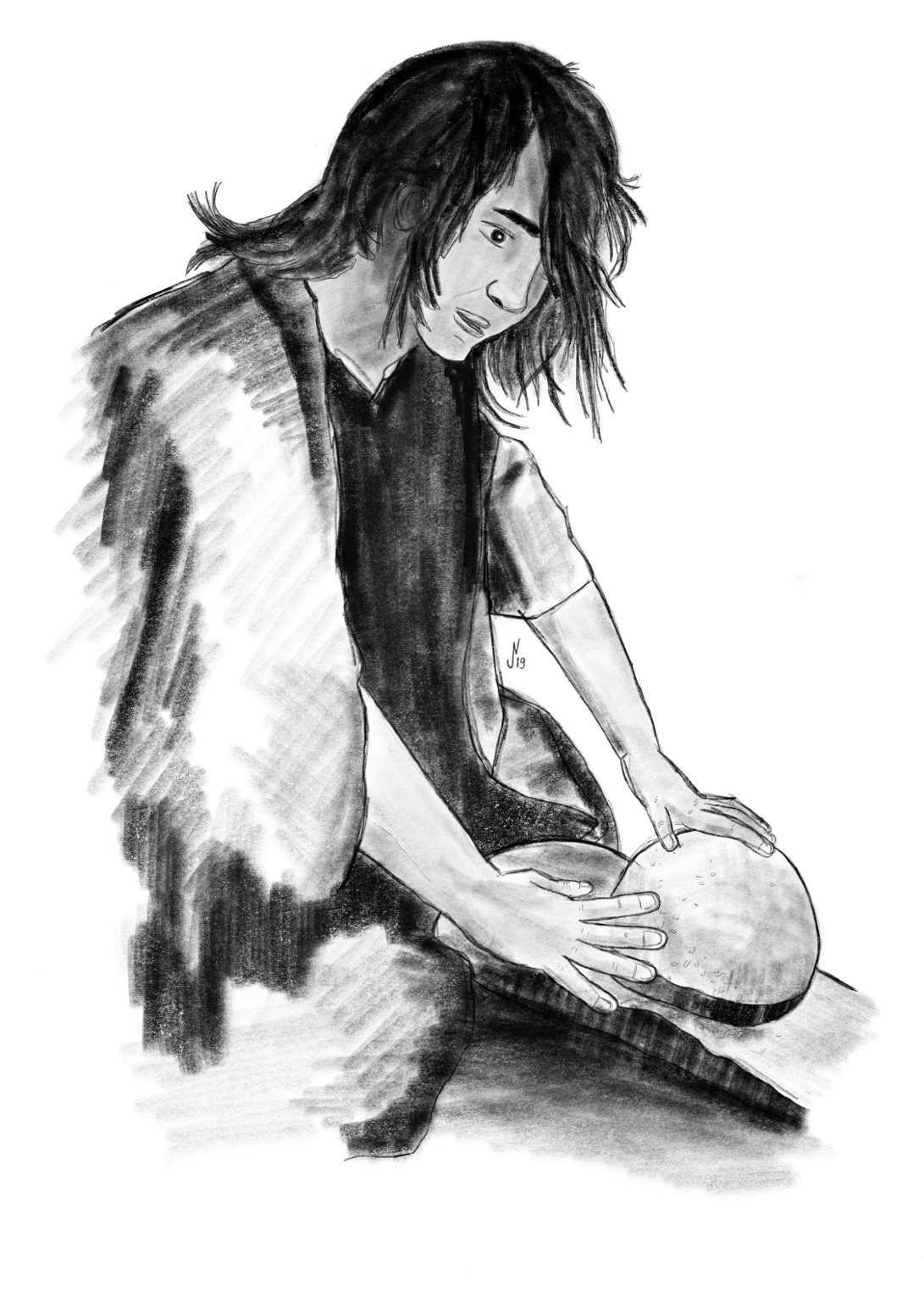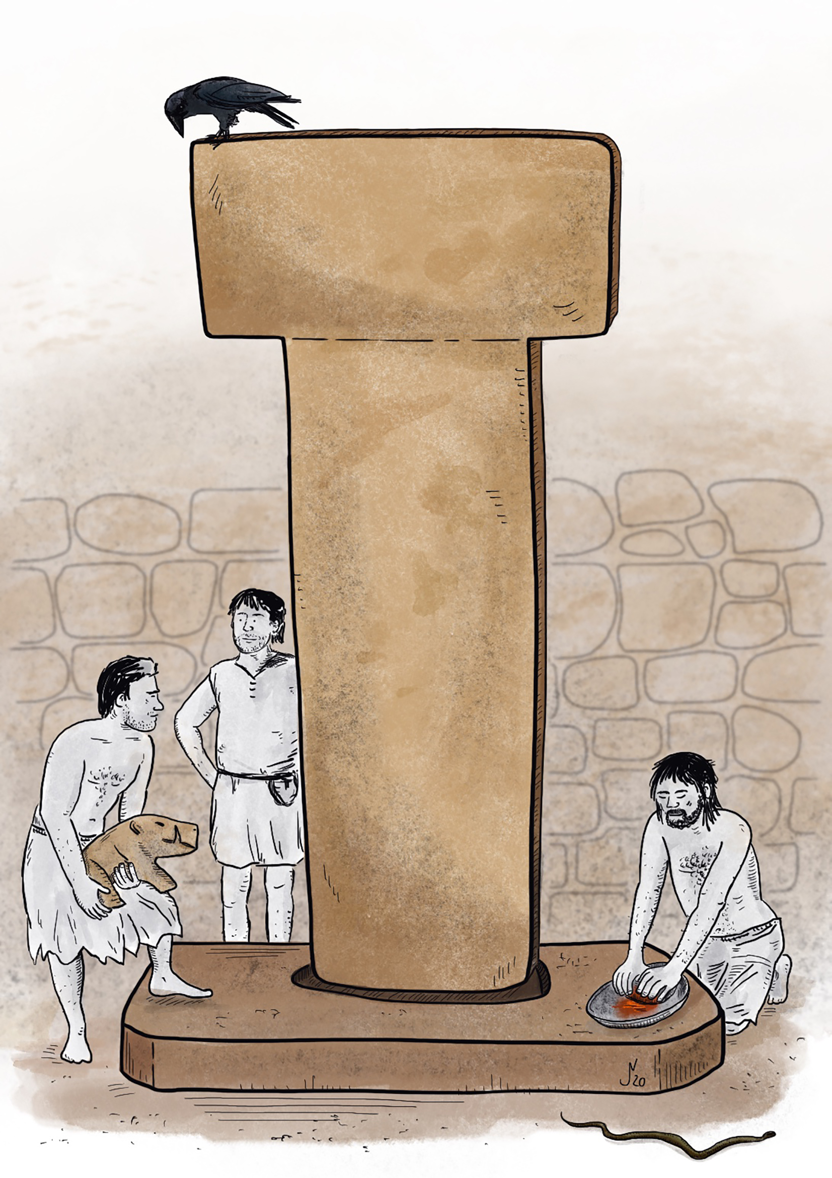 Illustration of food processing on the roofs of early Neolithic Göbekli Tepe (Turkey) and the grinding of red ochre in the course of ritual activity there for L. Dietrich, Plant Food Processing Tools at Early Neolithic Göbekli Tepe, Summertown: Archaeopress 2021.