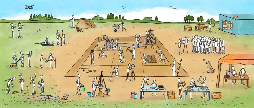 “Wimmelbild” produced for the website of the German Archaeological Institute, illustrating the many different activities and methods linked to an archaeological excavation.