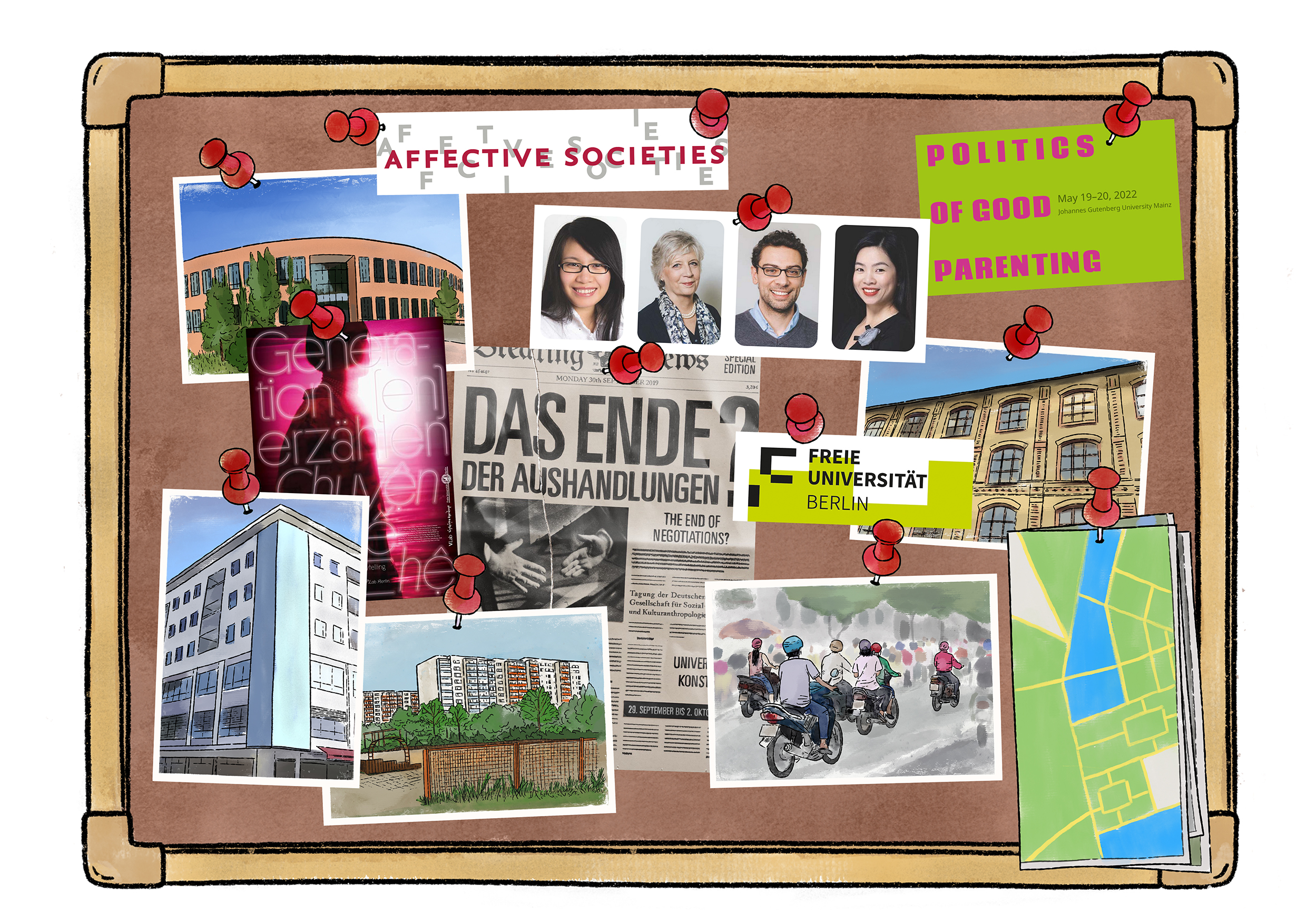 Illustrations for a scrollytelling project biography of the Collaborative Research Centre “Affective Societies – Dynamics of social coexistence in mobile worlds” at the Free University of Berlin.